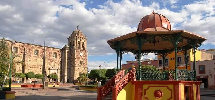 Centro colonial con kiosco, portal de tiendas y arquitectura del siglo XVIII.Hacienda El Arenal – 5 km – 20.9060° N, 103.8020° W